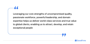 “Best Company To Work With” is an exclusive program run by GoodFirms where the Leaders Matrix companies are recognized with a Badge, an exclusive article about the Company, and a supporting PR. Such recognition stands as a support to developing trust and authenticity within the B2B community. It also allows the participating companies to improve their ranking – rank higher in the Leaders Matrix categories, receive inbound backlinks from GoodFirms LeadersRoundtable podcast campaign, and get a certified Badge saying, “Best Company to Work With.”